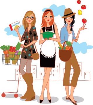 Illustrations de cuisine et bien-être Bio-kitchen victime qui achète ses fruits et légumes au marché bio mais qui n’hésite pas à passer chez Picard, néo-tradi un brin old-school façon Bree Van de Kamp, ou easy-cooking adepte de la cuisine en kit ? Illustration réalisée pour « Les coups d’food de Farida », éditions du Chêne.