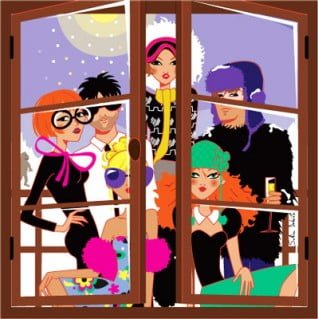 Dessin humoristique 2 copines discutent en rigolant sur une terrasse en sirotant un cocktail. Leur style est coloré, les coupes évoquent les années 60.